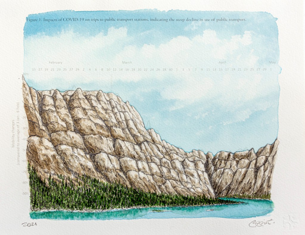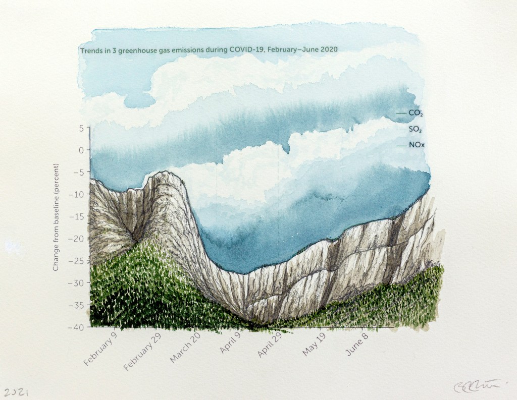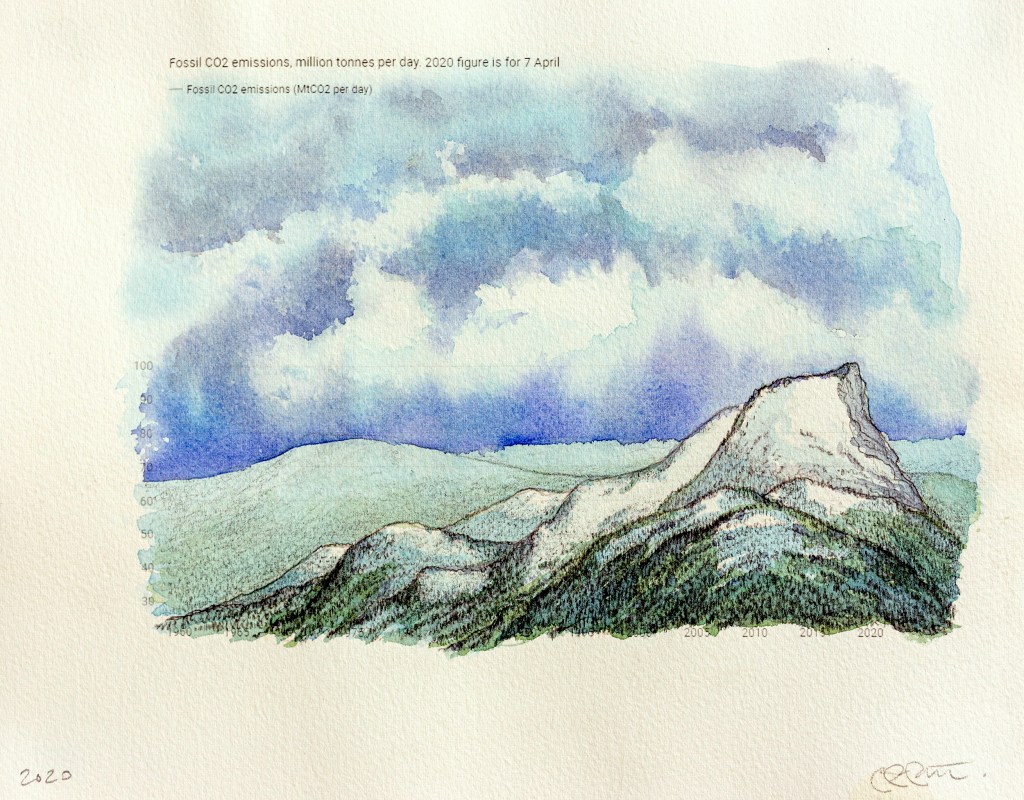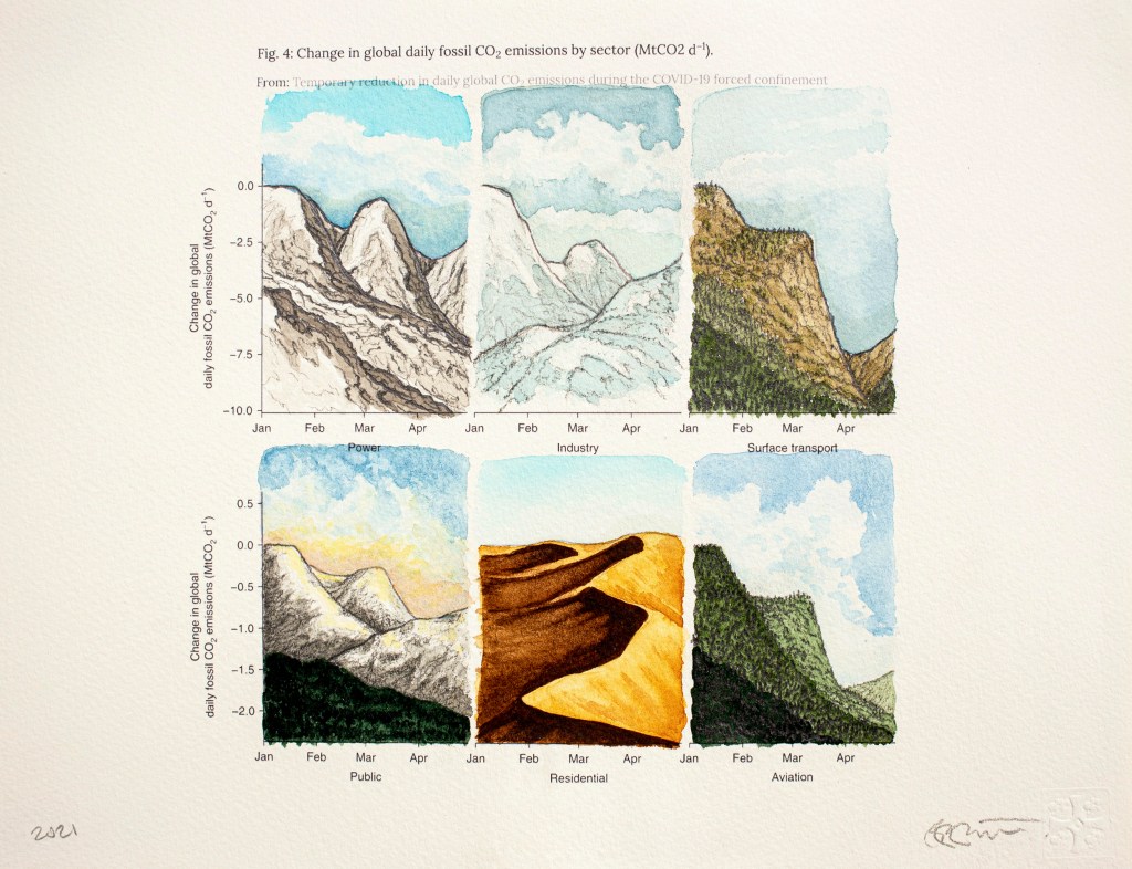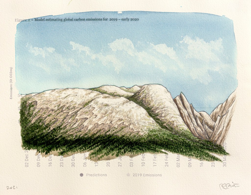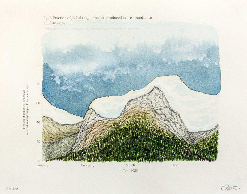 Paysages inattendus | Anthropause est le titre d’une série de paysages au crayon et à l’aquarelle crées à partir de courbes statistiques sur les changements climatiques, mais plus particulièrement sur la période de confinement et de réduction de l’activité humaine observée dans de nombreux pays au début de la pandémie de Covid 19. Cette réduction globale de l’activité économique, industrielle et touristique fut qualifiée du néologisme « anthropause » par certains chercheurs et semble avoir eu des impacts positifs inattendus sur la qualité de l’air, le bruit sismique, le retour de certaines espèces animales en milieu urbain et la réduction de nombreuse activités polluantes.