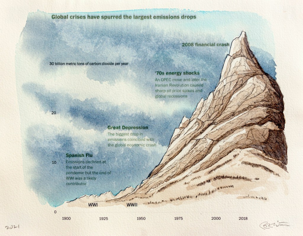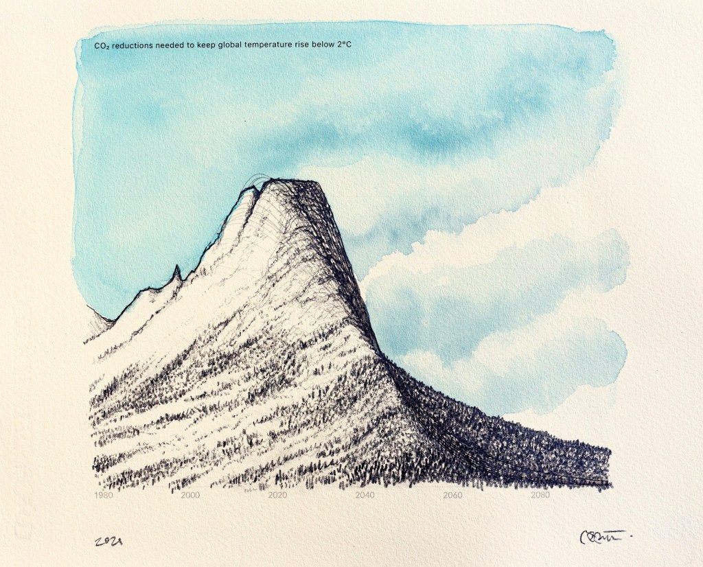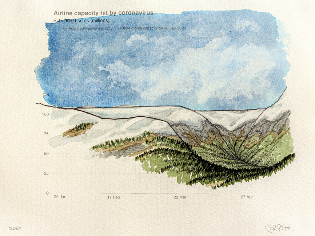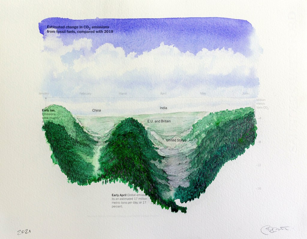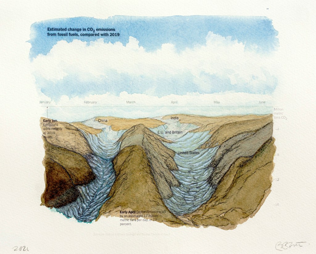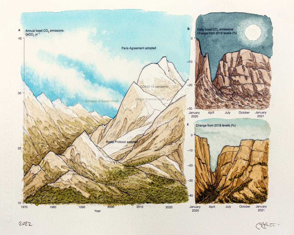 Paysages inattendus | Anthropause est le titre d’une série de paysages au crayon et à l’aquarelle crées à partir de courbes statistiques sur les changements climatiques, mais plus particulièrement sur la période de confinement et de réduction de l’activité humaine observée dans de nombreux pays au début de la pandémie de Covid 19. Cette réduction globale de l’activité économique, industrielle et touristique fut qualifiée du néologisme « anthropause » par certains chercheurs et semble avoir eu des impacts positifs inattendus sur la qualité de l’air, le bruit sismique, le retour de certaines espèces animales en milieu urbain et la réduction de nombreuse activités polluantes.