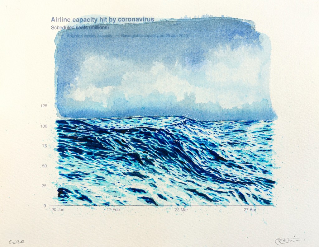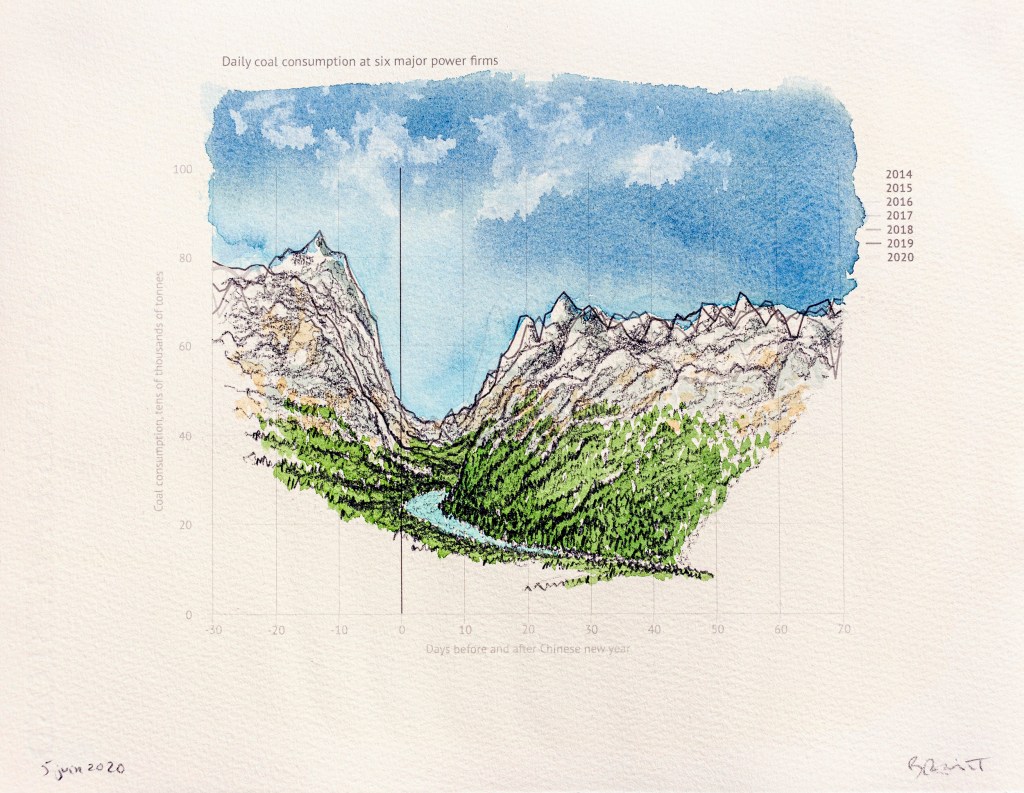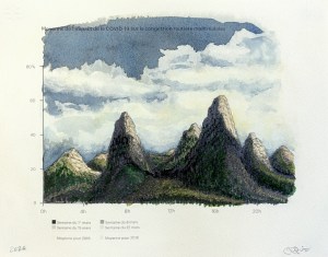Unexpected landscapes | Anthropause is the title of a series of watercolor and pencil drawings created from statistical graphs on climate change, but more specifically on the period of confinement and reduction of human activity observed in many countries in the early months of the Covid 19 pandemic. This overall reduction in economic, industrial and tourist activity has been dubbed the neologism « anthropause » by some researchers and seems to have had unexpected positive impacts on air quality, seismic noise, the return of certain animal species to urban areas and the reduction of many polluting activities.
