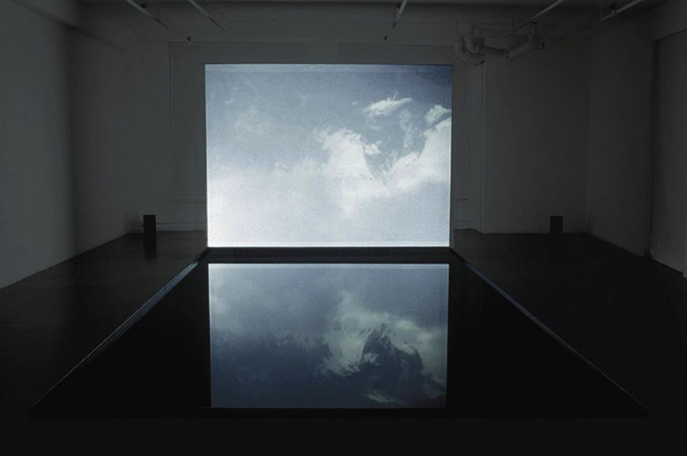 L’installation Dérive est née au hasard d’une séquence enregistrée lors d’une croisière sur un lac de Suisse centrale. Par un renversement « accidentel » ces sommets partiellement enneigés, captés sous cette lumière m’ont soudain paru prendre une dimension poétique insoupçonnée. Ciel nuageux, vue d’avion ou glaciers à la dérive… L’espace d’un instant (étiré par le recours au ralenti) la distinction entre le ciel et la terre ne tient plus.